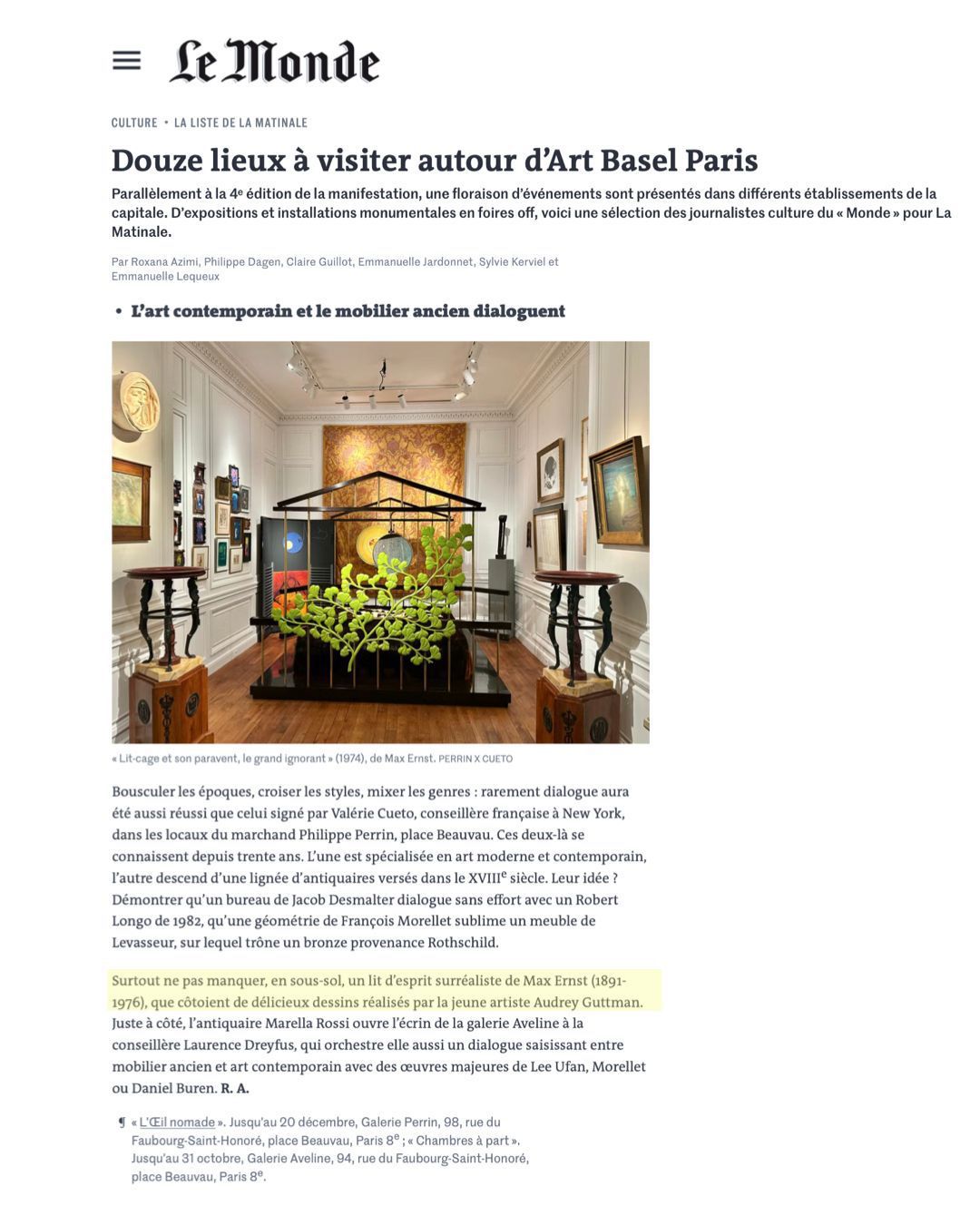 Surtout ne pas manquer, en sous-sol, un lit d'esprit surréaliste de Max Ernst (1891-1976), que côtoient de délicieux dessins réalisés par la jeune artiste Audrey Guttman. Juste à côté, l'antiquaire Marella Rossi ouvre l'écrin de la galerie Aveline à la conseillère Laurence Dreyfus, qui orchestre elle aussi un dialogue saisissant entre mobilier ancien et art contemporain avec des oeuvres majeures de Lee Ufan, Morellet ou Daniel Buren. R.A.